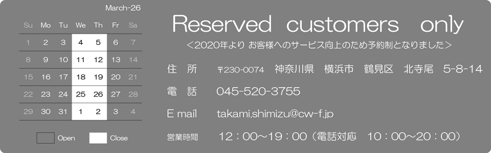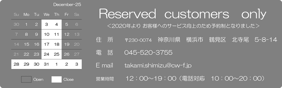 | 2020年04月 | サービス向上のため、会員制、予約制スタート! |
