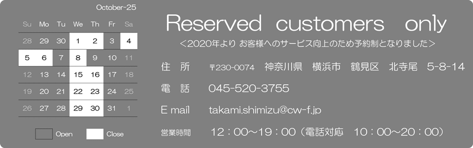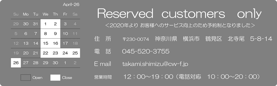 | 2020年04月 | サービス向上のため、会員制、予約制スタート! |